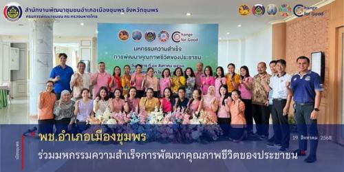 ในการนี้ สำนักงานพัฒนาชุมชนอำเภอเมืองชุมพร โดยนายสุภัทร ขจรมาศบุษป์ พัฒนาการอำเภอเมืองชุมพร พร้อมด้วย เจ้าหน้าที่พัฒนาชุมชนอำเภอเมืองชุมพร และตัวแทนกองทุนพัฒนาบทบาทสตรี ผู้นำอช.เข้าร่วมมหกรรมความสำเร็จการพัฒนาคุณภาพชีวิตของประชาชน