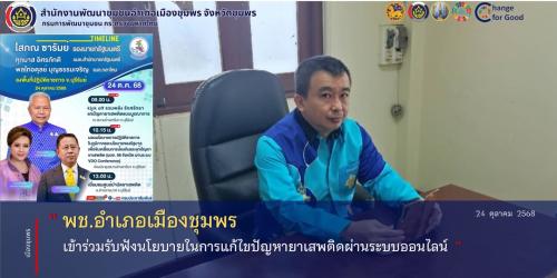 วันที่ 24 ตุลาคม 2568 สำนักงานพัฒฯาชุมชนอำเภอเมืองชุมพร โดย นายสุภัทร ขจรมาศบุษป์ พัฒนาการอำเภอเมืองชุมพร เข้าร่วมรับฟังนโยบายในการแก้ไขปัญหายาเสพติด ผ่านสื่ออิเล็กทรอนิกส์ ในงานรวมพลัง รักศรัทธา แก้ปัญหายาเสพติดแบบูรณาการ Big Quick Win : ขับเคลื่อนอย่างรวดเร็ว สู่ชัยชนะที่ยิ่งใหญ่ ณ สนามกีฬา ธันเดอร์คาสเซิล สเตเดียม (ข้างอารีนา) จังหวัดบุรีรัมย์ โดยมีนายโสภณ ซารัย์ รองนายกรัฐมนตรี เป็นประธาน