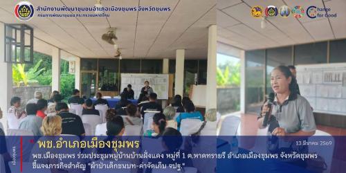 นายสุภัทร ขจรมาศบุษป์ พัฒนาการอำเภอเมืองชุมพร มอบหมายให้นางศรีรัชดา พรรณา นักวิชาการพัฒนาชุมชนชำนาญการ เข้าร่วมการประชุมประจำเดือนของหมู่บ้านบ้านฝั่งแดง ตำบลหาดทรายรี เพื่อชี้แจงแนวทางการดำเนินงานและประชาสัมพันธ์ภารกิจสำคัญของกรมการพัฒนาชุมชน ทั้งการทอดผ้าป่ากองทุนพัฒนาเด็กชนบทฯ และแนวทางการเบิกจ่ายค่าตอบแทนการจัดเก็บข้อมูล จปฐ.